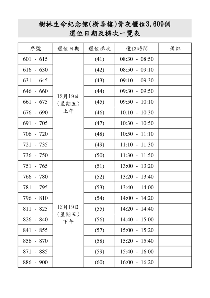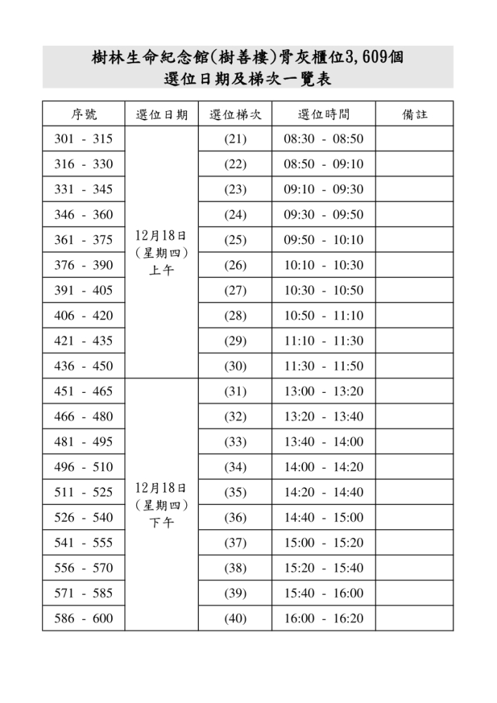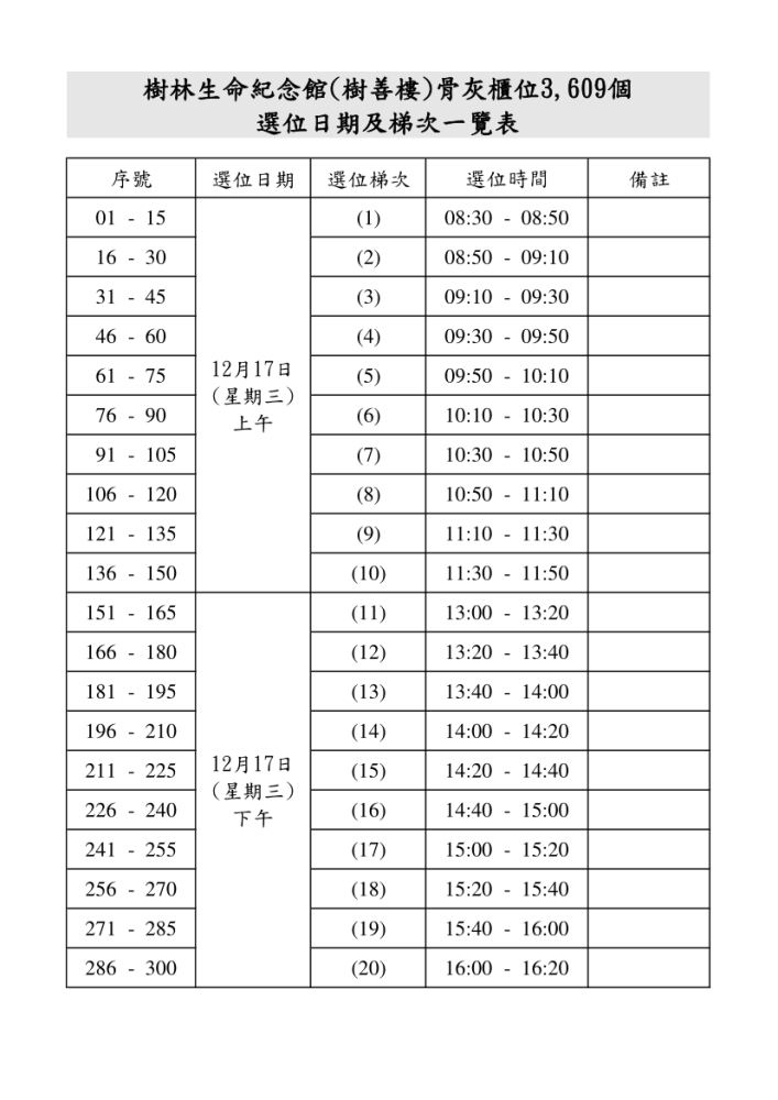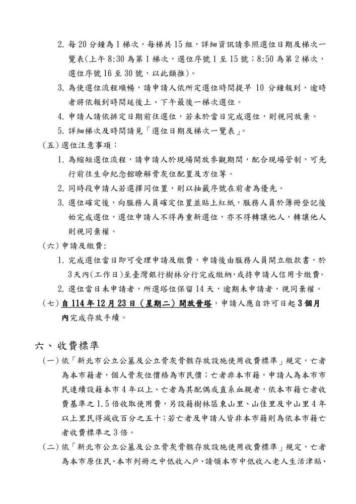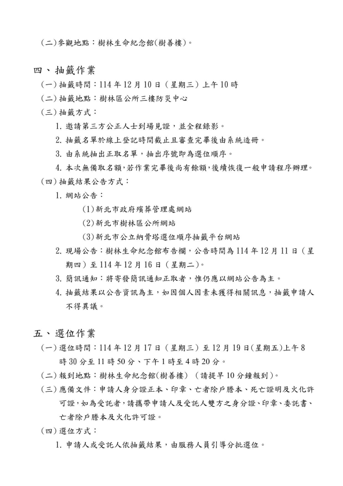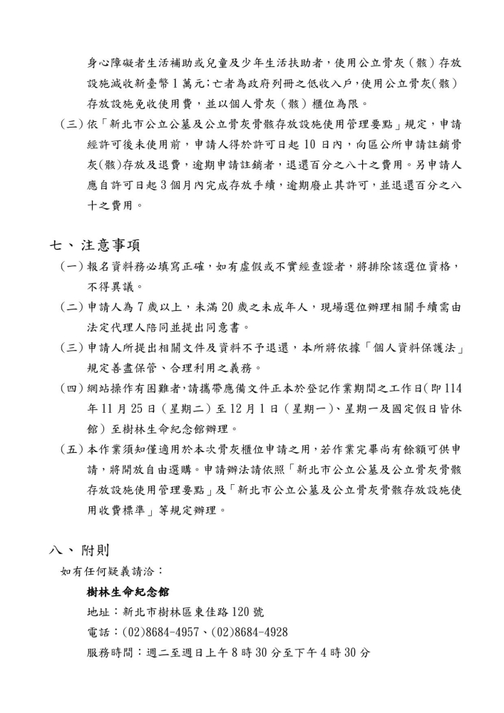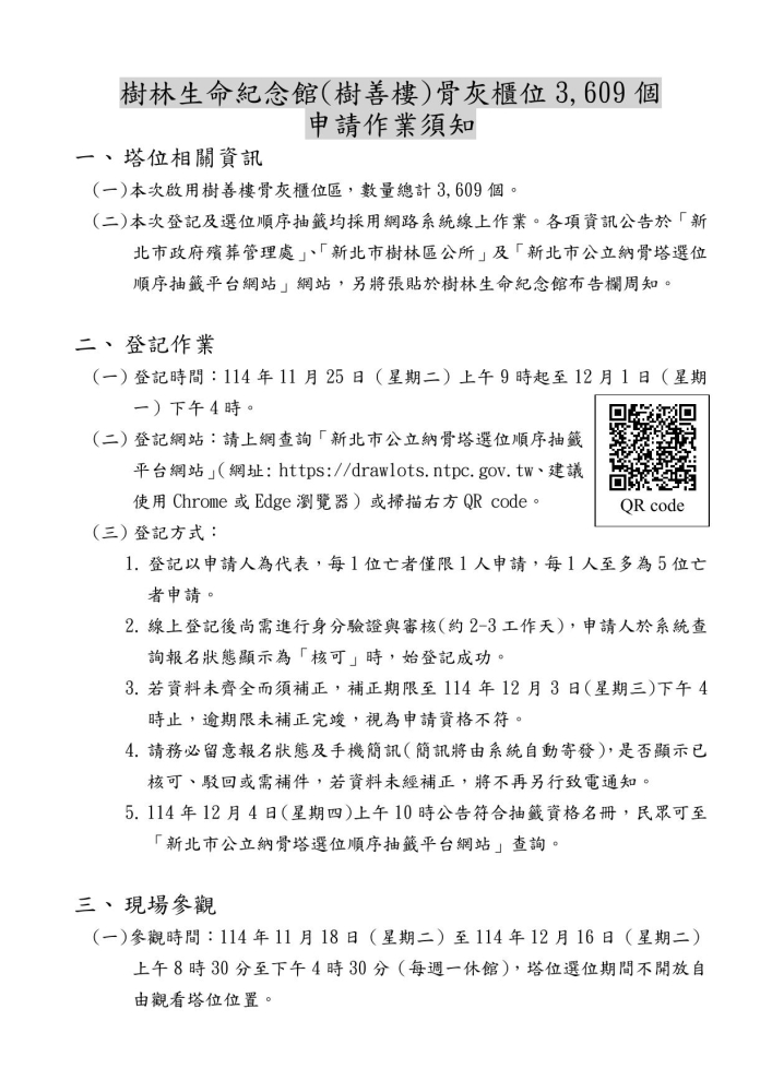 公告新北市樹林生命紀念館(樹善樓)骨灰櫃位3,609個申請作業須知